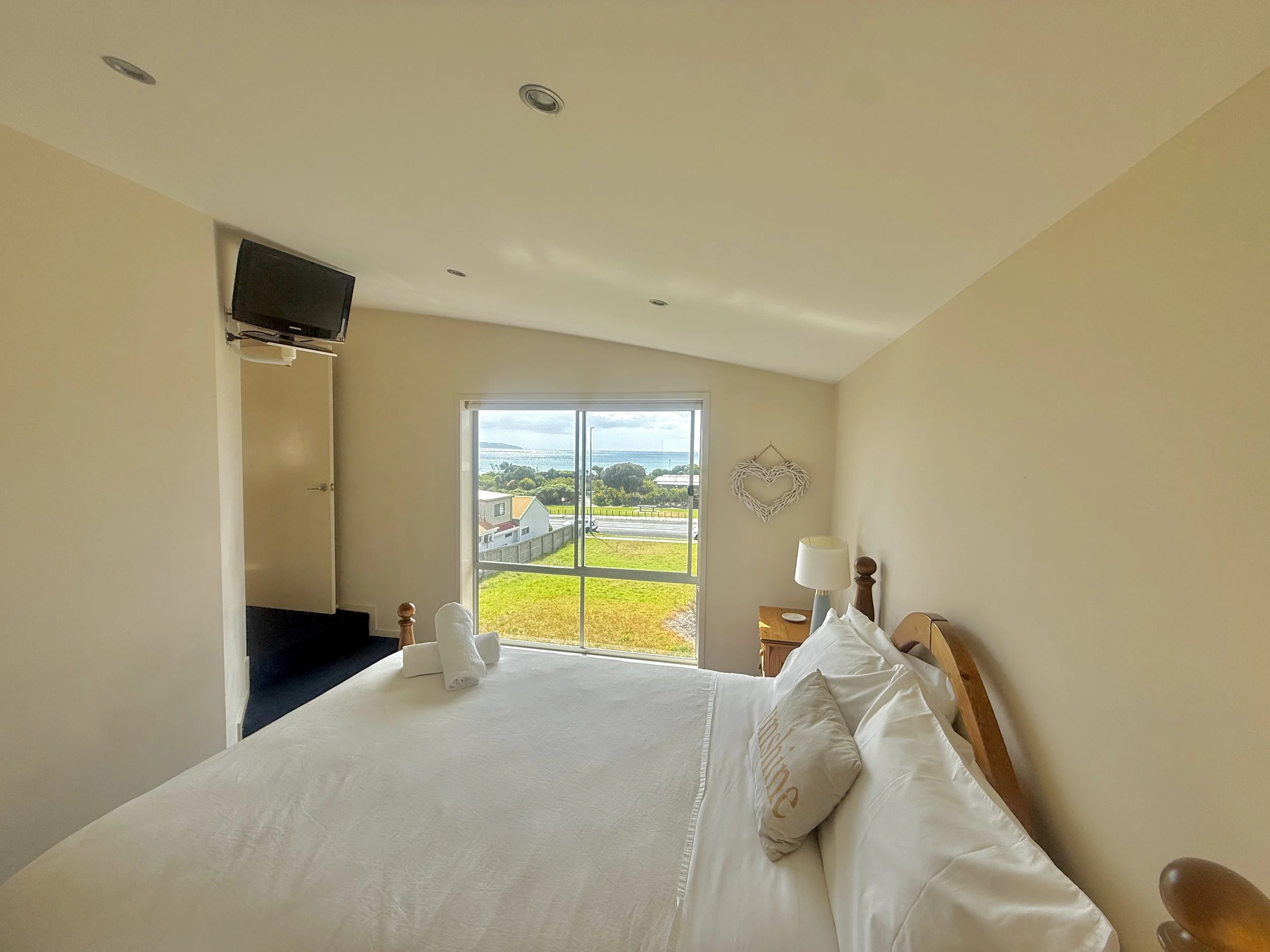 The Master bedroom offers ocean views and a queen size bed with en-suite featuring a large corner spa bath.