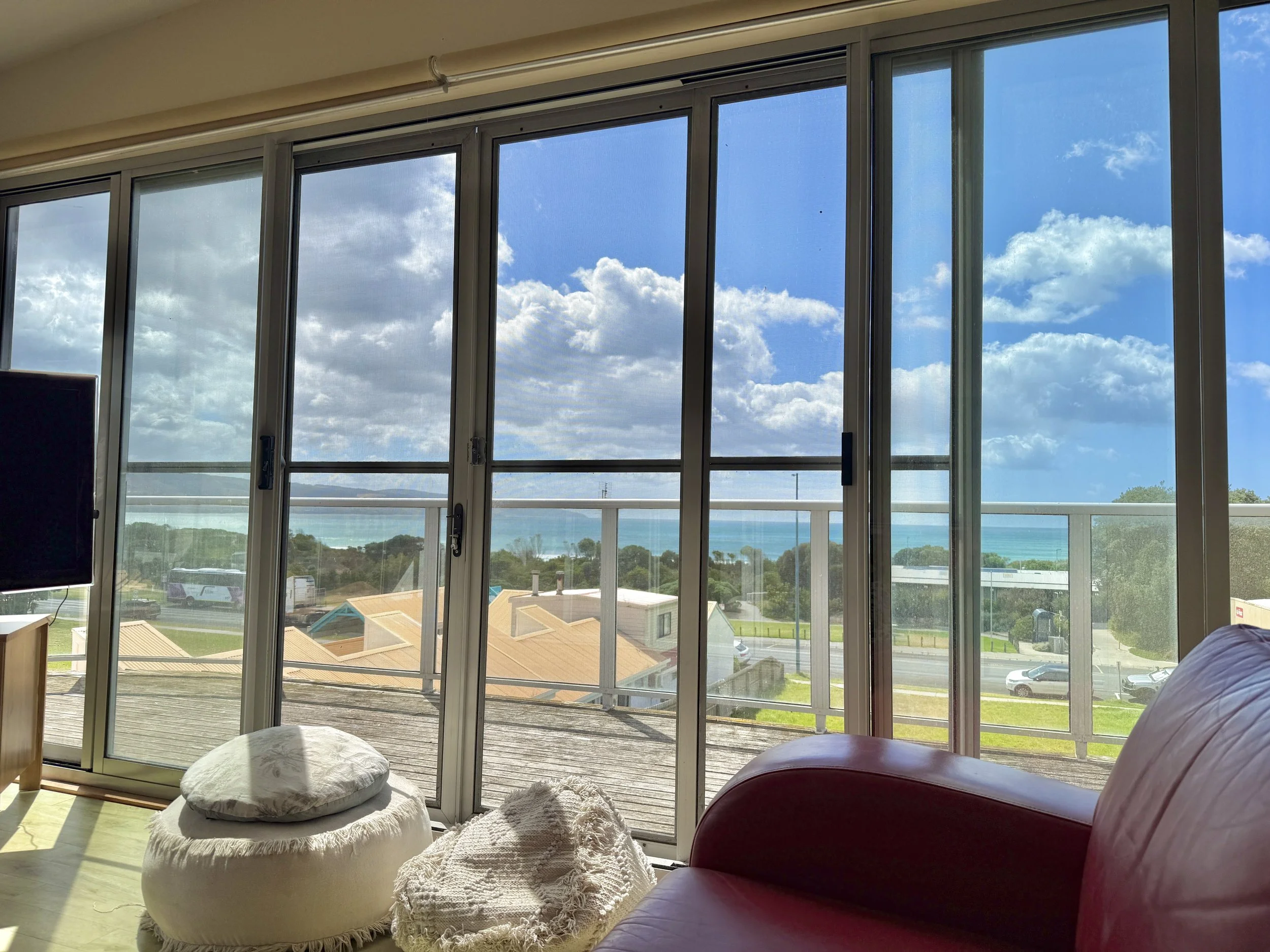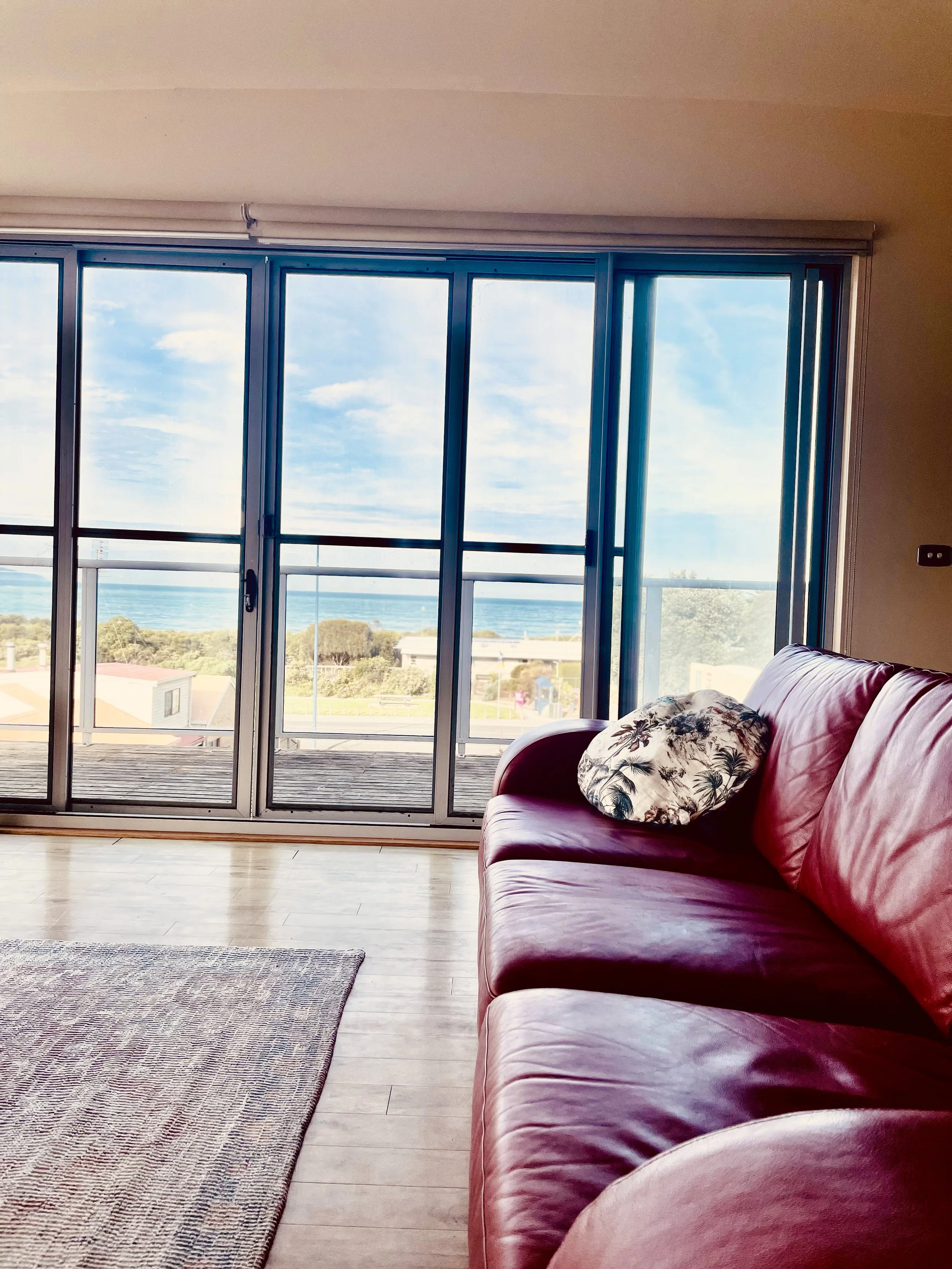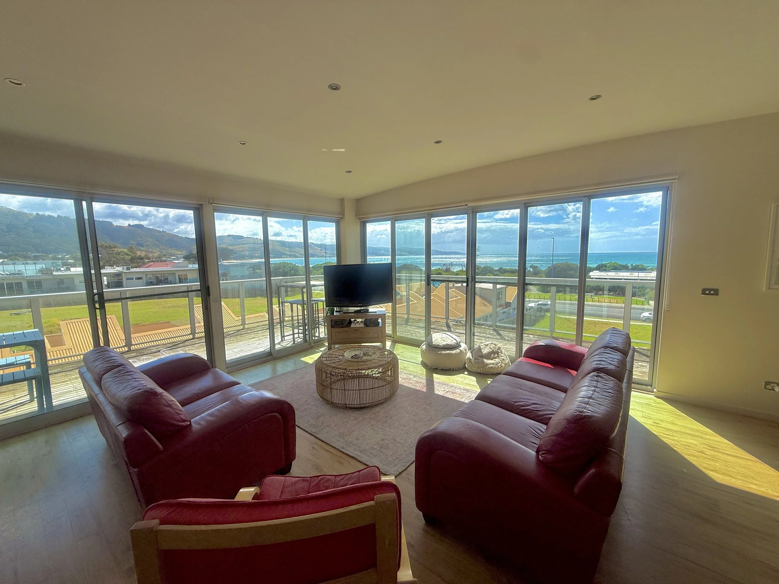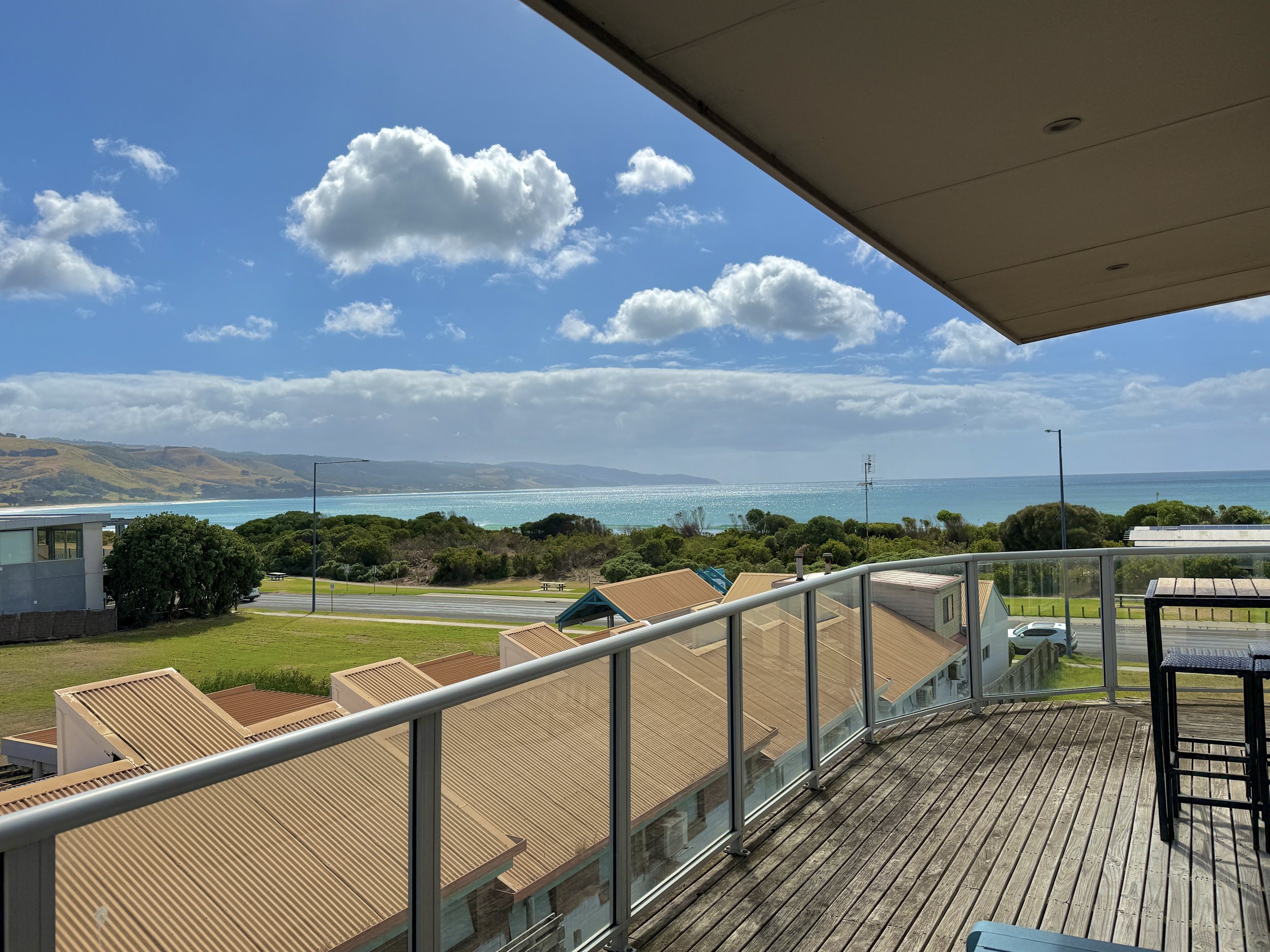 Large wrap around balcony with furniture and BBQ overlooking the Apollo Bay township and ocean views.