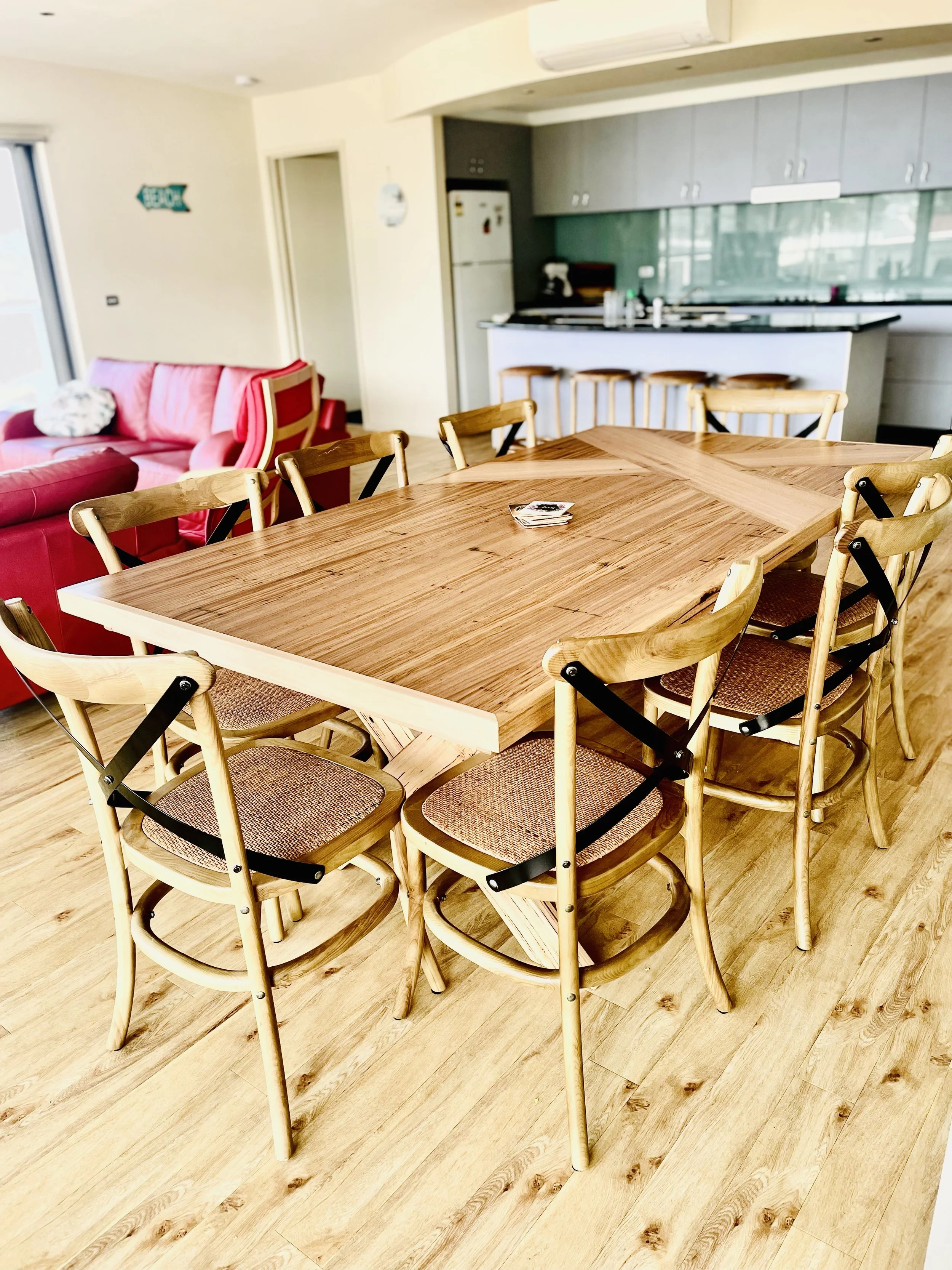 The top floor of this holiday apartment accommodation boasts open plan living/kitchen/dining with Ocean views. The fully equipped kitchen offers electric stove/oven, dishwasher, microwave, coffee pod machine (Nespresso version) dining table for 6, leather couches, TV, reverse cycle heating and cooling.
