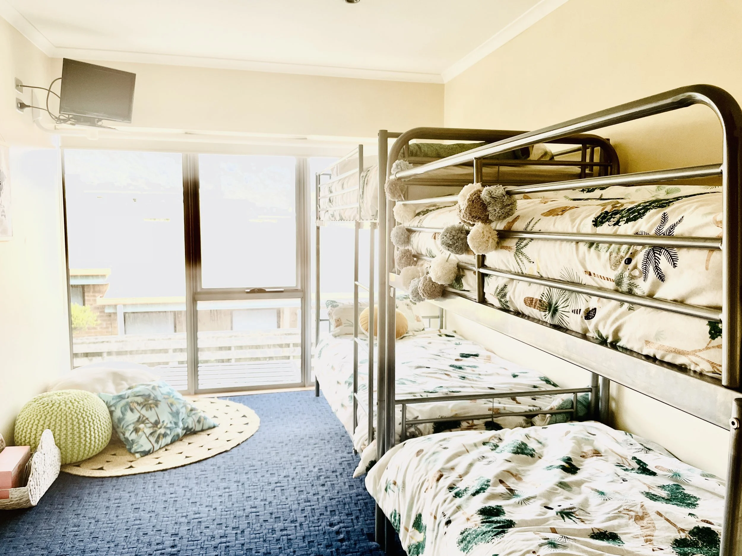 Offering 2 more bedrooms one with Queen bed the other with 2 sets of single bunks. The Bathroom/Laundry offer shower, toilet, vanity, washing machine.